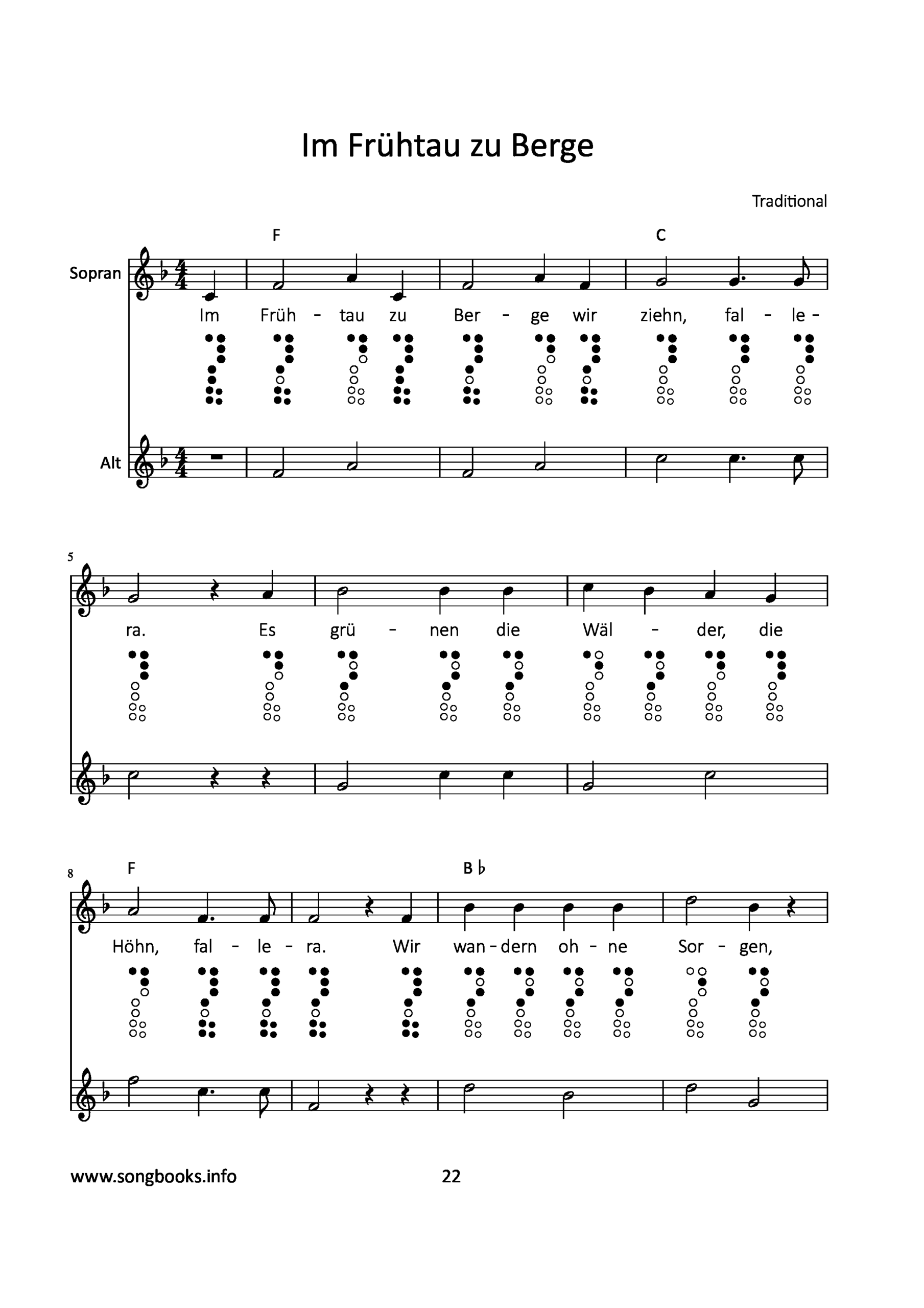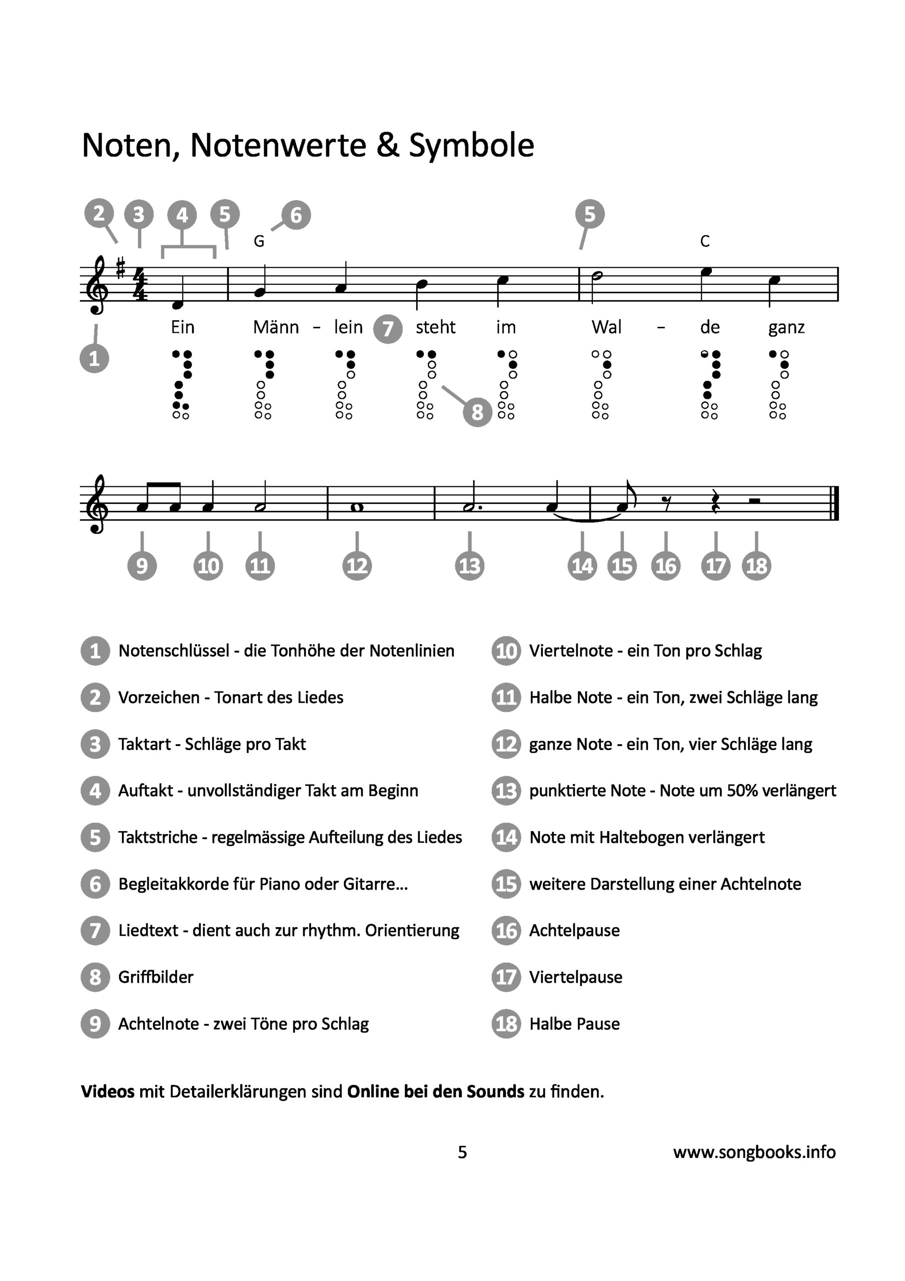 Alle Lieder sind in klassischer Notenschrift notiert, plus Griffbilder für die Sopranblockflöte in barocker Griffweise. Die Noten für die Altblockflöte (in F) alleine sind auch als Download vorhanden, inkl. Griffbilder.