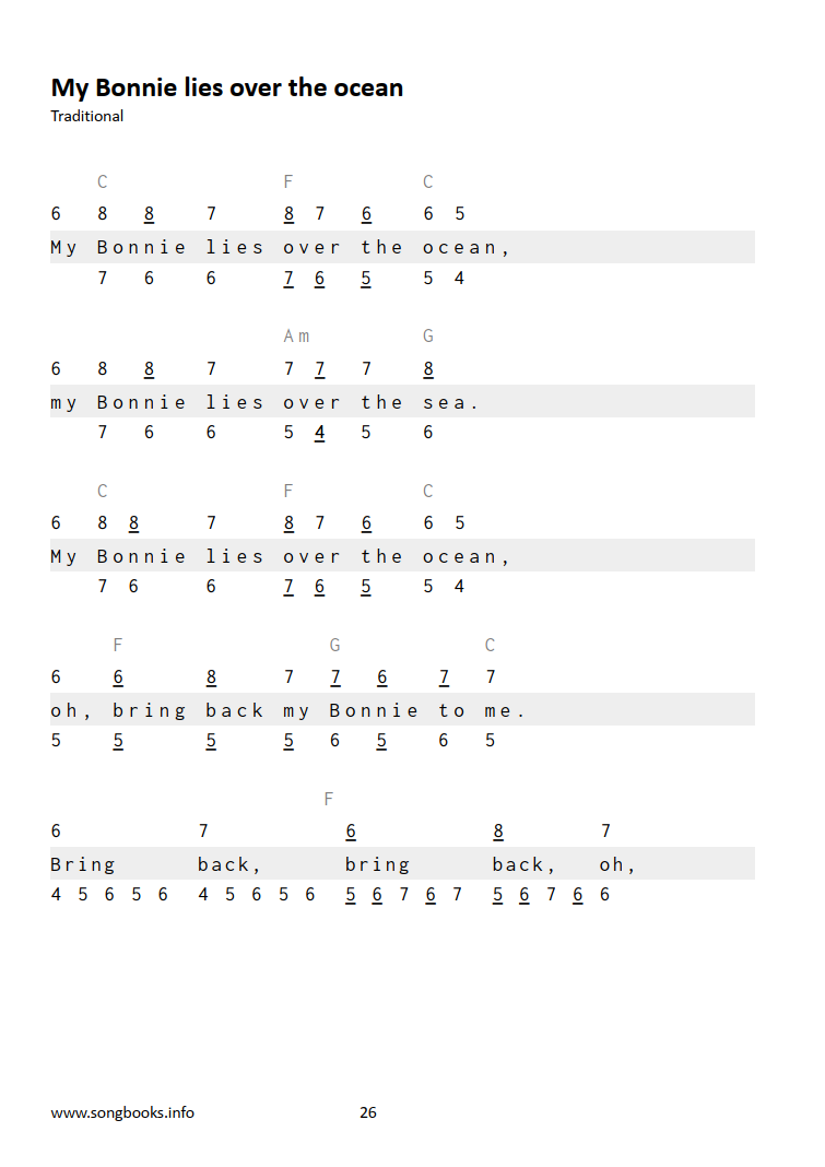 Songs: Angel Band / Banks of the Sacramento / Banks of the Ohio / Camptown Races / Dixie / Foggy Foggy Dew / Joshua Fit the Battle of Jericho / Muss i denn (Wooden Heart) / Kumbaya my Lord / My Bonnie lies over the ocean / Oh my darling Clementine / Oh Susanna / Old Folks at Home (Swanee River) / On top of Old Smokey / Red River Valley / Skye Boat Song / Sometimes I feel like a motherless child / Sweet Betsy from Pike / That’s what’s the Matter / The house of the rising sun / Worried man / Whiskey in the Jar / Will the Circle Be Unbroken? / We shall overcome / Yankee Doodle