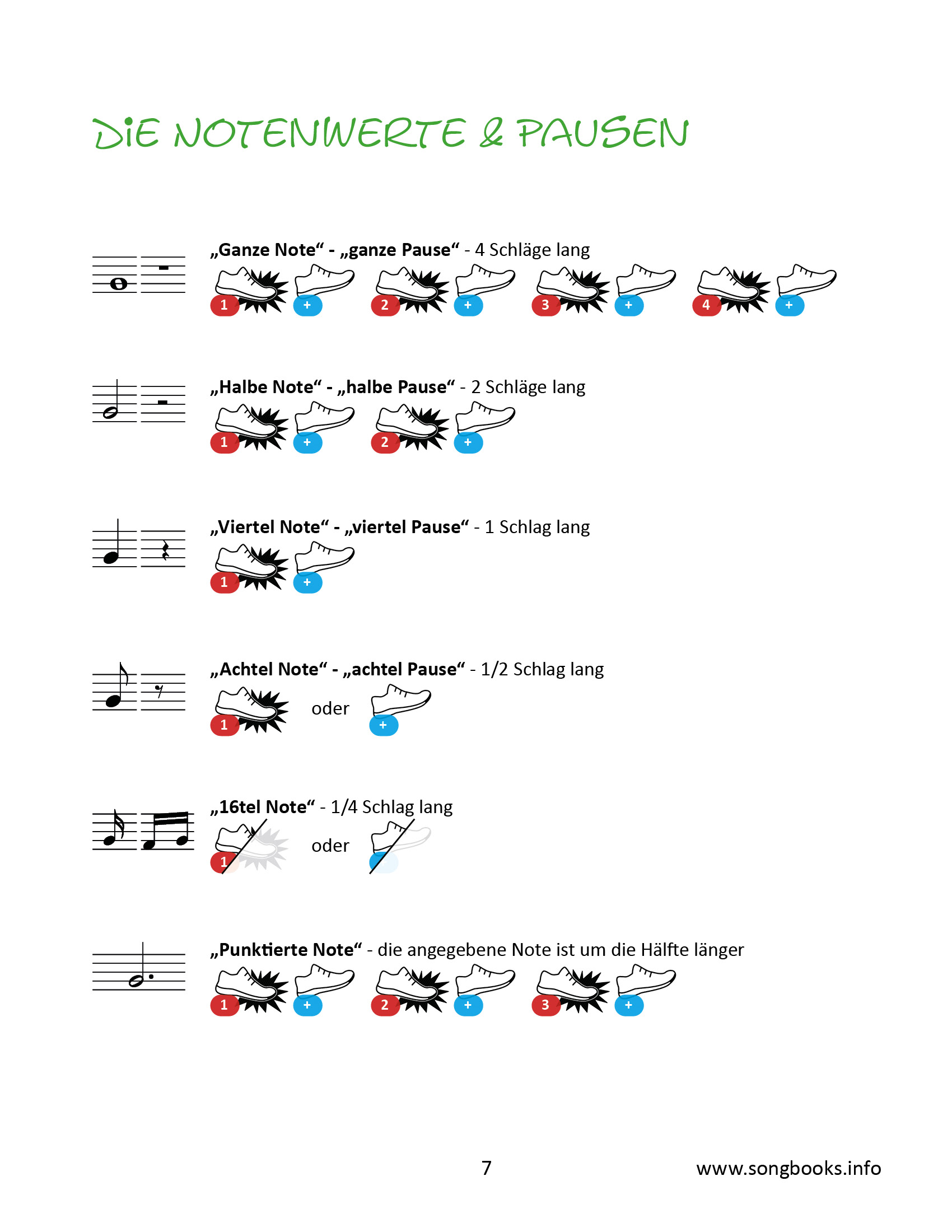 Die Lieder sind mit farbigen Noten – passend zu den Farben auf der Triola – notiert, zusätzlich sind die Namen der Töne zu sehen. Die Notenwerte und Pausen werden mit Bildern erklärt.